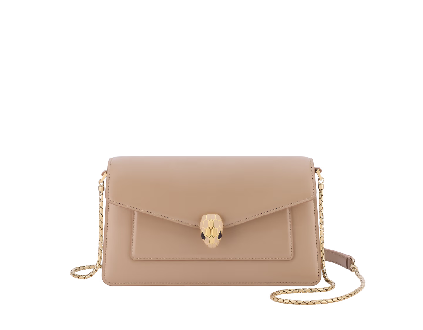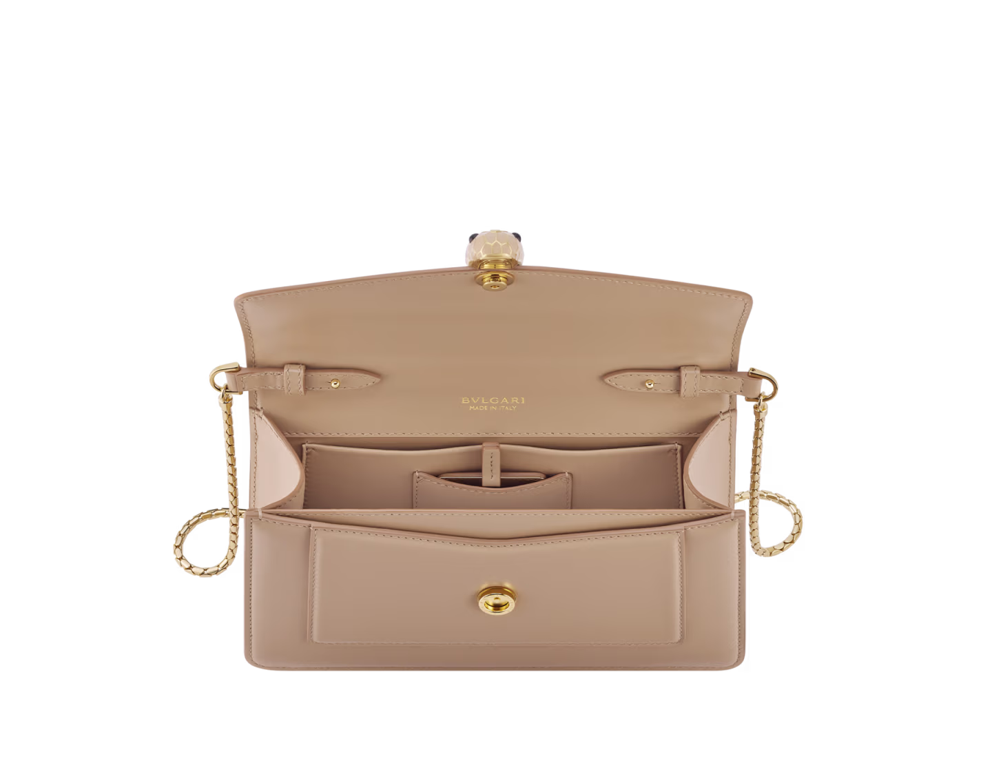 A modern evolution of a timeless icon, the Serpenti Forever small crossbody bag offers a captivating blend of playful wearability, contemporary aesthetics and unmistakable details. Crafted in Travertine calf leather, the model is crowned with the iconic snakehead magnetic closure, whose mesmerising scales and design draw from the Serpenti jewellery of the 1960s. Enhancing its versatile appeal, the snake body-inspired Cobra chain strap can be effortlessly replaced with the additionally provided wide leather strap, for a more casual wear. The bag features a single compartment, an internal flat pocket, two external open pockets, a mirror pocket with a customisable mirror and the Bvlgari metal logo on the back. 23 x 13 x 6 cm – 9.1 x 5.1 x 2.4 inches